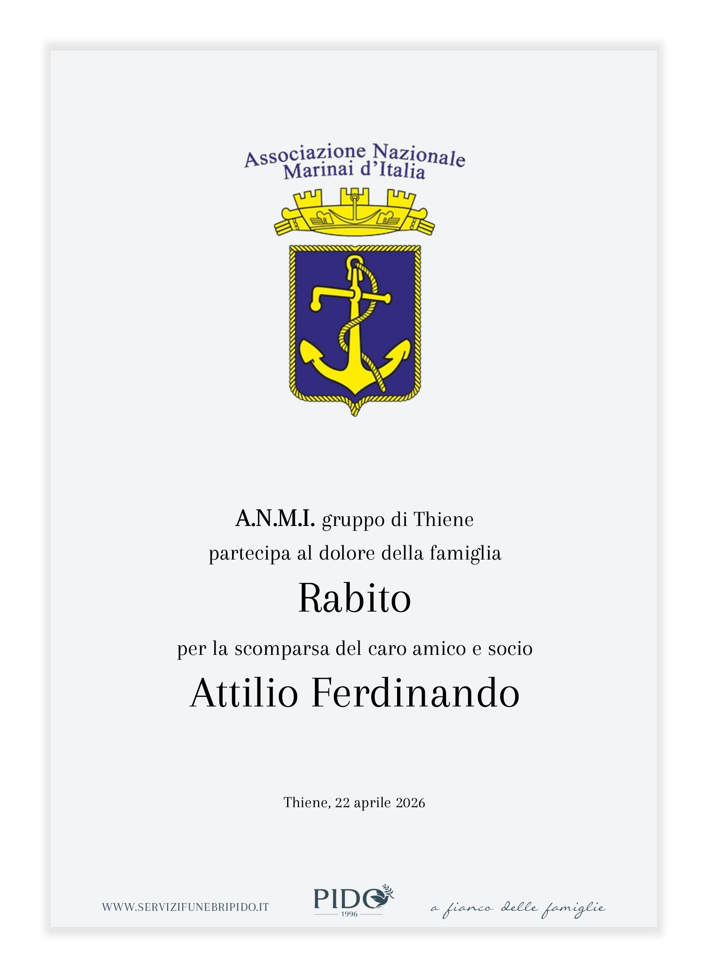 A.M.N.I. Ferdinando Attilio RabitoVinicio Pido2026-04-22T16:12:04+02:00 Stampa in ricordoMessaggio di cordoglioSuggerimenti frasi di cordoglioInvia un messaggio di cordoglio alla famiglia. Il messaggio verrà recapitato in forma privata. Privacy Policy *Devi accettare le condizioni sulla privacyHo letto l’informativa e autorizzo il trattamento dei miei dati personali per le finalità ivi indicate. *Invia messaggioGrazie, il suo messaggio di cordoglio verrà recapitato in forma privata alla famiglia.×Si è verificato un errore nel tentativo di inviare il suo messaggio. Per favore riprova più tardi.× Condividi il suo ricordo FacebookXWhatsAppEmail