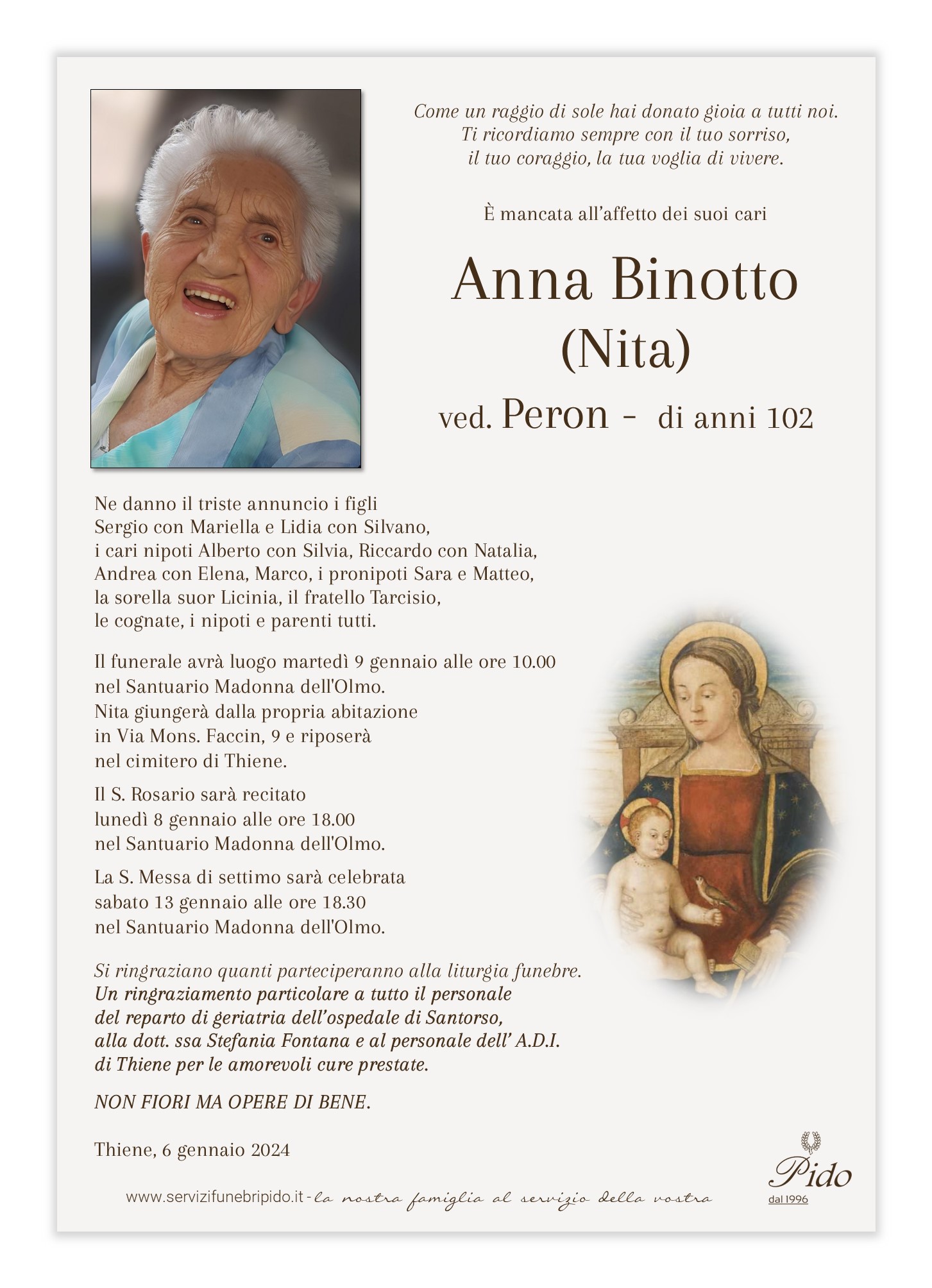 Anna Binotto (Nita)Vinicio Pido2024-01-06T11:55:54+01:00 Stampa in ricordoInvia un messaggio di cordoglio alla famiglia. Il messaggio verrà recapitato in forma privata. Privacy Policy *Devi accettare le condizioni sulla privacyHo letto l’informativa e autorizzo il trattamento dei miei dati personali per le finalità ivi indicate. *Invia messaggio di cordoglioGrazie, il suo messaggio di cordoglio verrà recapitato in forma privata alla famiglia.×Si è verificato un errore nel tentativo di inviare il suo messaggio. Per favore riprova più tardi.× Condividi il suo ricordo FacebookXWhatsAppEmail