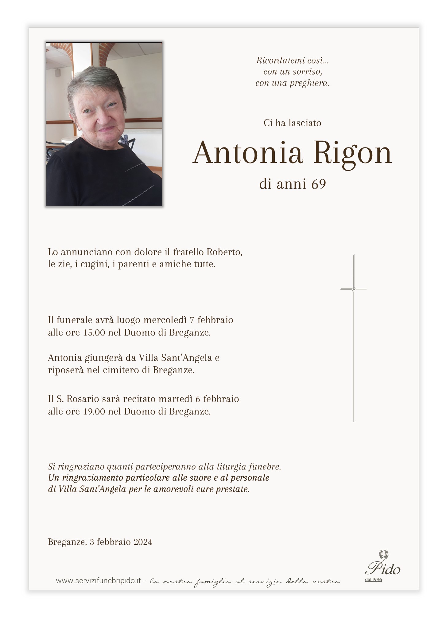 Antonia RigonVinicio Pido2024-02-06T08:46:36+01:00 Stampa in ricordoInvia un messaggio di cordoglio alla famiglia. Il messaggio verrà recapitato in forma privata. Privacy Policy *Devi accettare le condizioni sulla privacyHo letto l’informativa e autorizzo il trattamento dei miei dati personali per le finalità ivi indicate. *Invia messaggio di cordoglioGrazie, il suo messaggio di cordoglio verrà recapitato in forma privata alla famiglia.×Si è verificato un errore nel tentativo di inviare il suo messaggio. Per favore riprova più tardi.× Condividi il suo ricordo FacebookXWhatsAppEmail