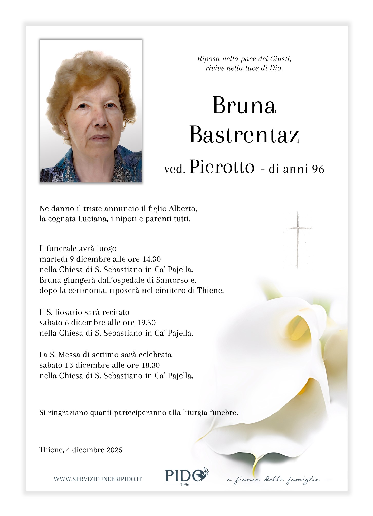 Bruna BastrentazVinicio Pido2025-12-04T17:29:52+01:00 Stampa in ricordoMessaggio di cordoglioSuggerimenti frasi di cordoglioInvia un messaggio di cordoglio alla famiglia. Il messaggio verrà recapitato in forma privata. Privacy Policy *Devi accettare le condizioni sulla privacyHo letto l’informativa e autorizzo il trattamento dei miei dati personali per le finalità ivi indicate. *Invia messaggioGrazie, il suo messaggio di cordoglio verrà recapitato in forma privata alla famiglia.×Si è verificato un errore nel tentativo di inviare il suo messaggio. Per favore riprova più tardi.× Condividi il suo ricordo FacebookXWhatsAppEmail