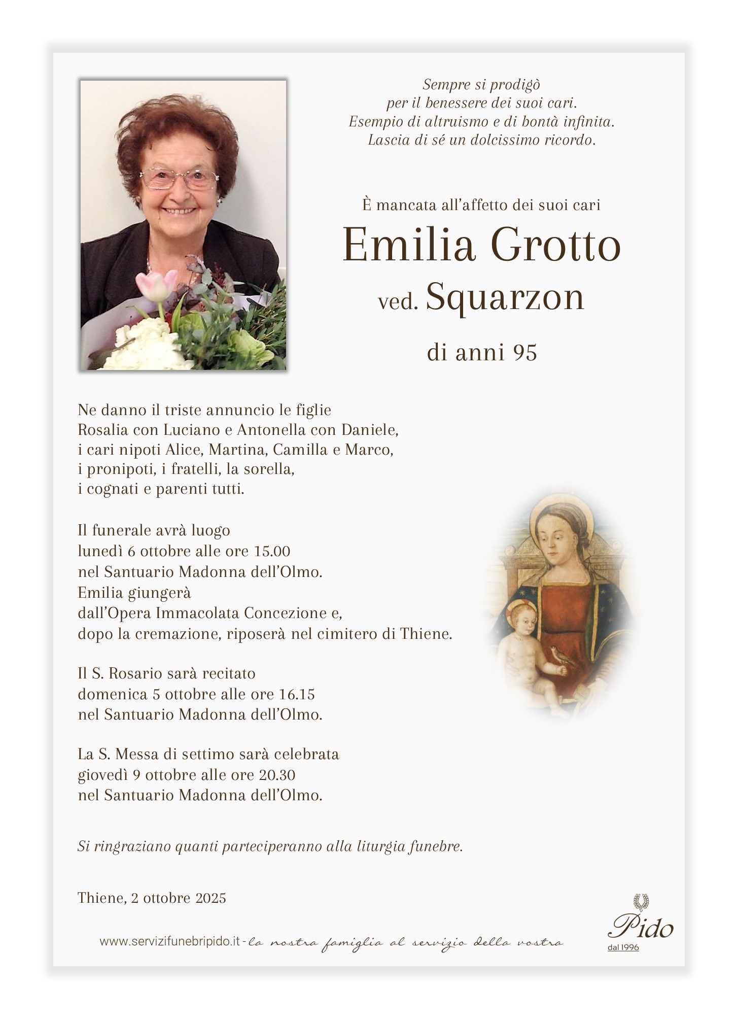 Emilia GrottoVinicio Pido2025-10-02T18:36:51+02:00 Stampa in ricordoMessaggio di cordoglioSuggerimenti frasi di cordoglioInvia un messaggio di cordoglio alla famiglia. Il messaggio verrà recapitato in forma privata. Privacy Policy *Devi accettare le condizioni sulla privacyHo letto l’informativa e autorizzo il trattamento dei miei dati personali per le finalità ivi indicate. *Invia messaggioGrazie, il suo messaggio di cordoglio verrà recapitato in forma privata alla famiglia.×Si è verificato un errore nel tentativo di inviare il suo messaggio. Per favore riprova più tardi.× Condividi il suo ricordo FacebookXWhatsAppEmail