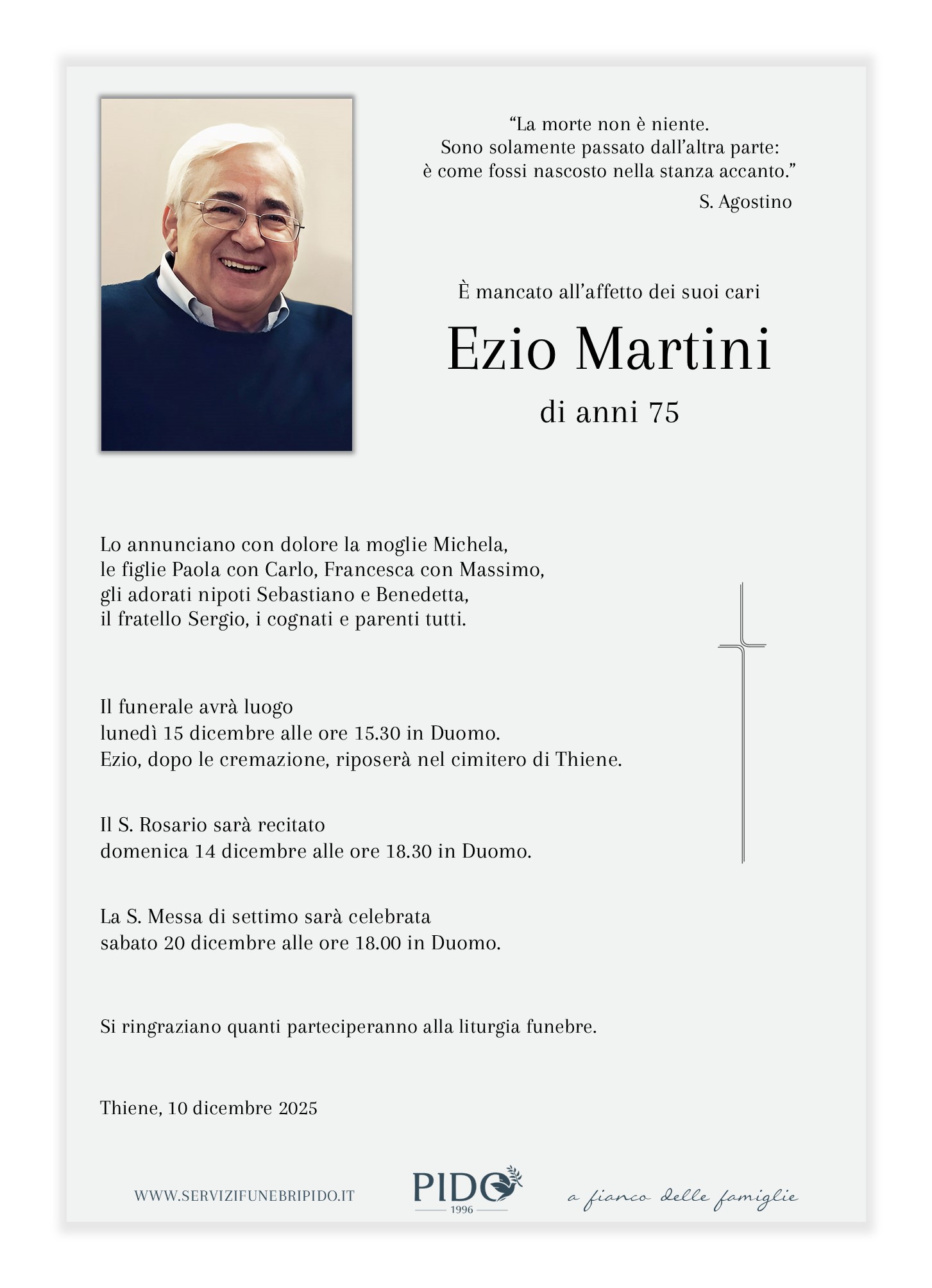 Ezio MartiniVinicio Pido2025-12-11T11:19:10+01:00 Stampa in ricordoMessaggio di cordoglioSuggerimenti frasi di cordoglioInvia un messaggio di cordoglio alla famiglia. Il messaggio verrà recapitato in forma privata. Privacy Policy *Devi accettare le condizioni sulla privacyHo letto l’informativa e autorizzo il trattamento dei miei dati personali per le finalità ivi indicate. *Invia messaggioGrazie, il suo messaggio di cordoglio verrà recapitato in forma privata alla famiglia.×Si è verificato un errore nel tentativo di inviare il suo messaggio. Per favore riprova più tardi.× Condividi il suo ricordo FacebookXWhatsAppEmail