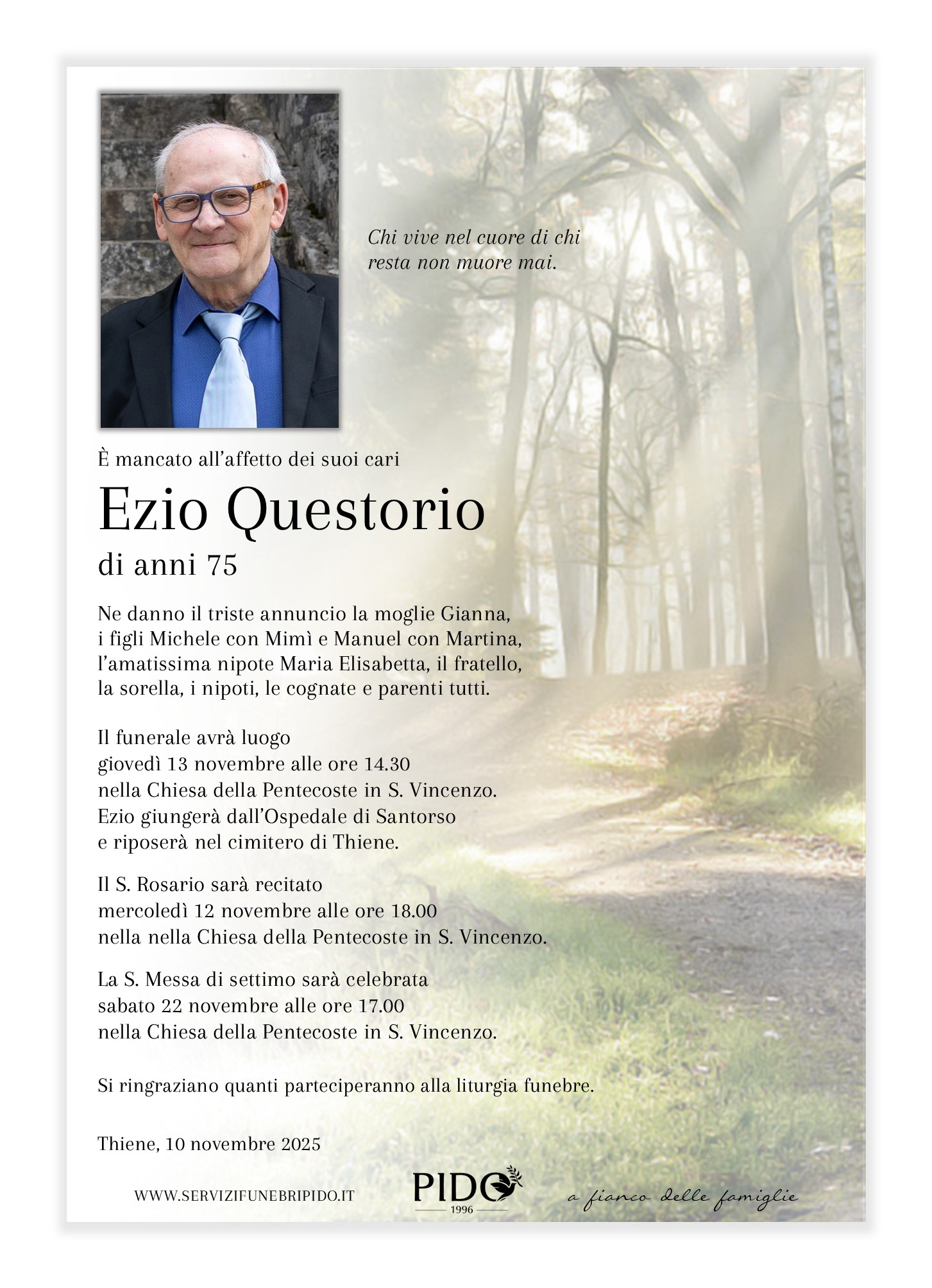 Ezio QuestorioVinicio Pido2025-11-11T15:36:32+01:00 Stampa in ricordoMessaggio di cordoglioSuggerimenti frasi di cordoglioInvia un messaggio di cordoglio alla famiglia. Il messaggio verrà recapitato in forma privata. Privacy Policy *Devi accettare le condizioni sulla privacyHo letto l’informativa e autorizzo il trattamento dei miei dati personali per le finalità ivi indicate. *Invia messaggioGrazie, il suo messaggio di cordoglio verrà recapitato in forma privata alla famiglia.×Si è verificato un errore nel tentativo di inviare il suo messaggio. Per favore riprova più tardi.× Condividi il suo ricordo FacebookXWhatsAppEmail