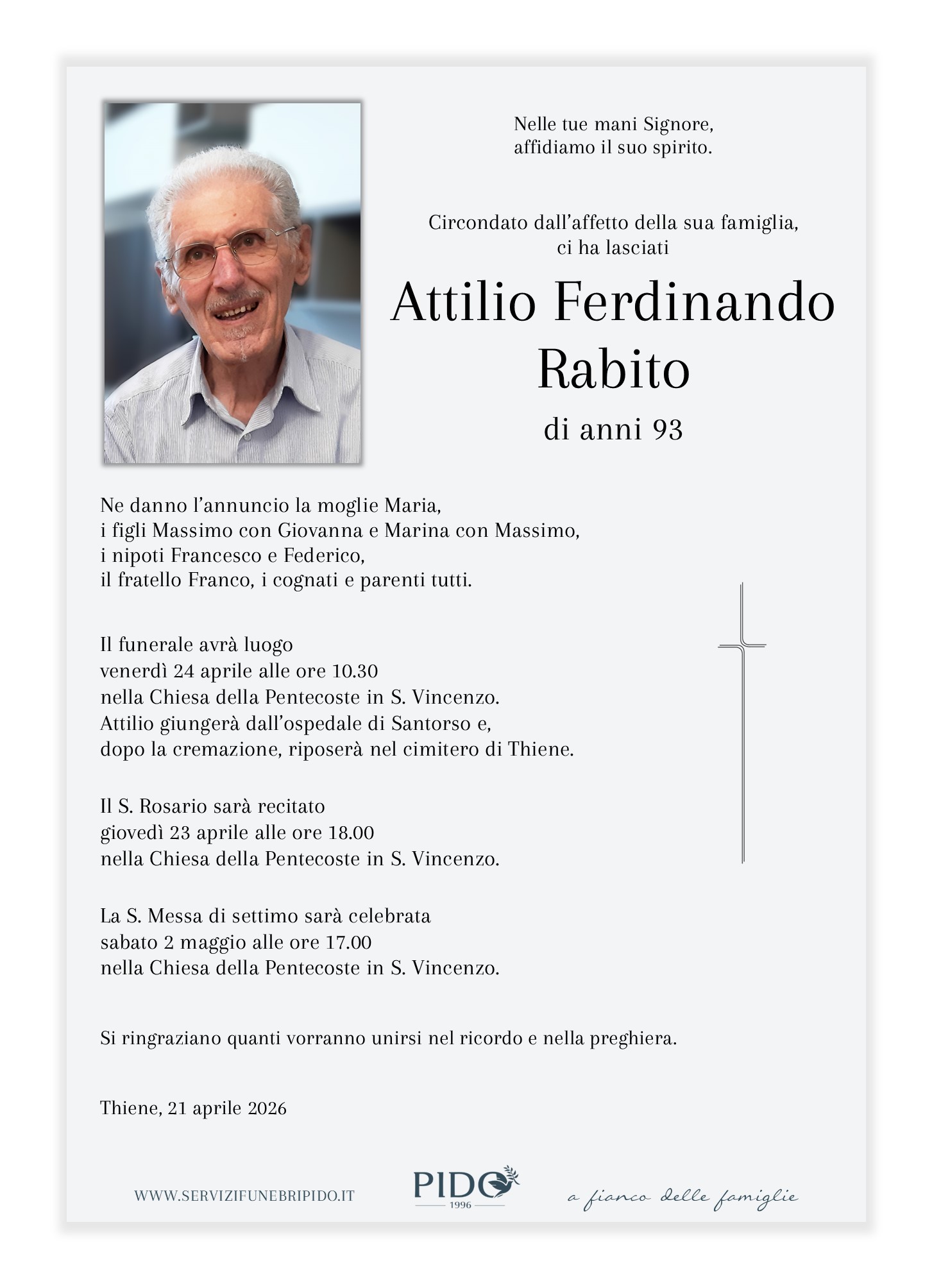 Ferdinando Attilio RabitoVinicio Pido2026-04-21T17:35:25+02:00 Stampa in ricordoMessaggio di cordoglioSuggerimenti frasi di cordoglioInvia un messaggio di cordoglio alla famiglia. Il messaggio verrà recapitato in forma privata. Privacy Policy *Devi accettare le condizioni sulla privacyHo letto l’informativa e autorizzo il trattamento dei miei dati personali per le finalità ivi indicate. *Invia messaggioGrazie, il suo messaggio di cordoglio verrà recapitato in forma privata alla famiglia.×Si è verificato un errore nel tentativo di inviare il suo messaggio. Per favore riprova più tardi.× Condividi il suo ricordo FacebookXWhatsAppEmail