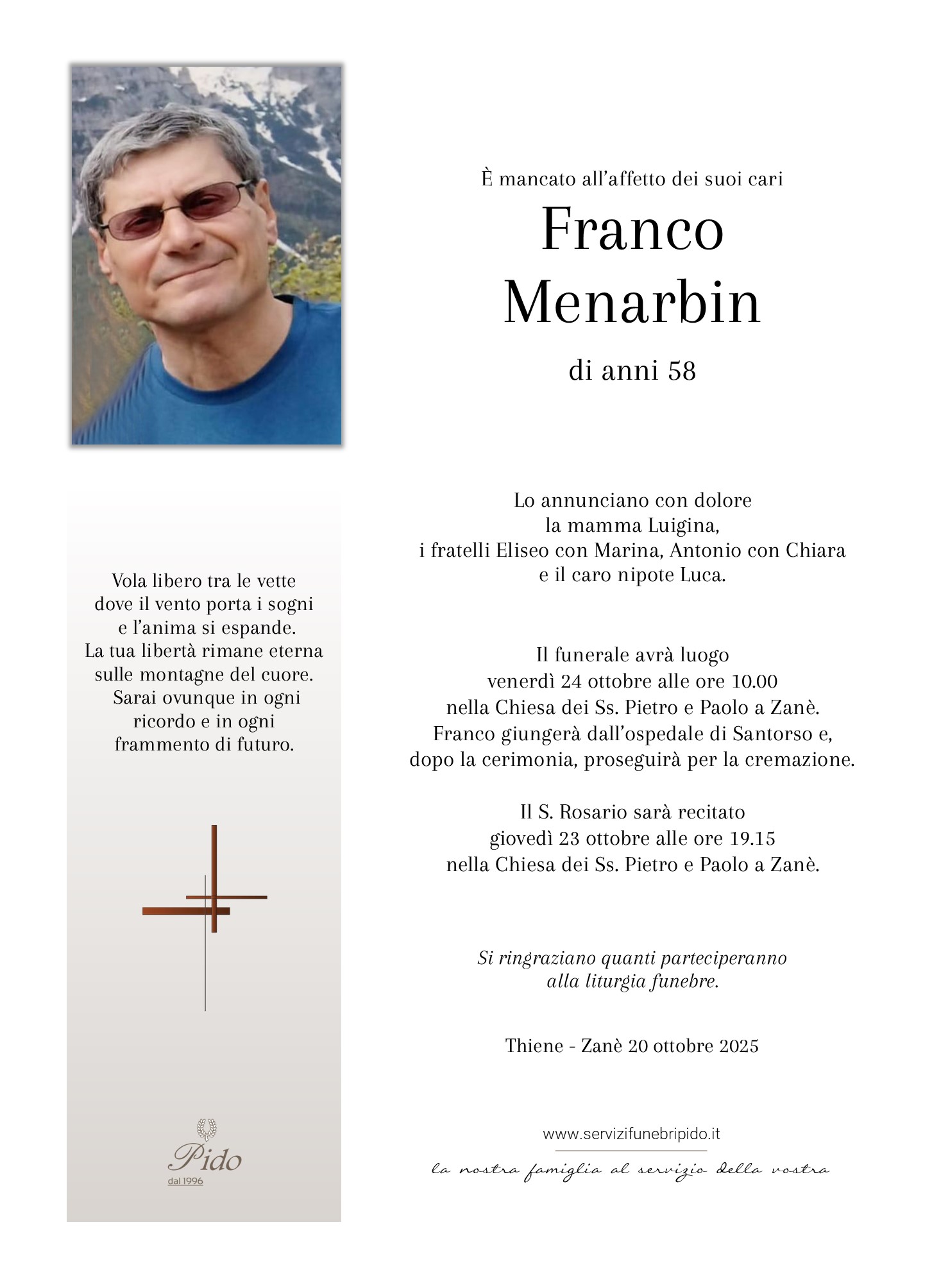 Franco MenarbinVinicio Pido2025-10-20T17:39:35+02:00 Stampa in ricordoMessaggio di cordoglioSuggerimenti frasi di cordoglioInvia un messaggio di cordoglio alla famiglia. Il messaggio verrà recapitato in forma privata. Privacy Policy *Devi accettare le condizioni sulla privacyHo letto l’informativa e autorizzo il trattamento dei miei dati personali per le finalità ivi indicate. *Invia messaggioGrazie, il suo messaggio di cordoglio verrà recapitato in forma privata alla famiglia.×Si è verificato un errore nel tentativo di inviare il suo messaggio. Per favore riprova più tardi.× Condividi il suo ricordo FacebookXWhatsAppEmail