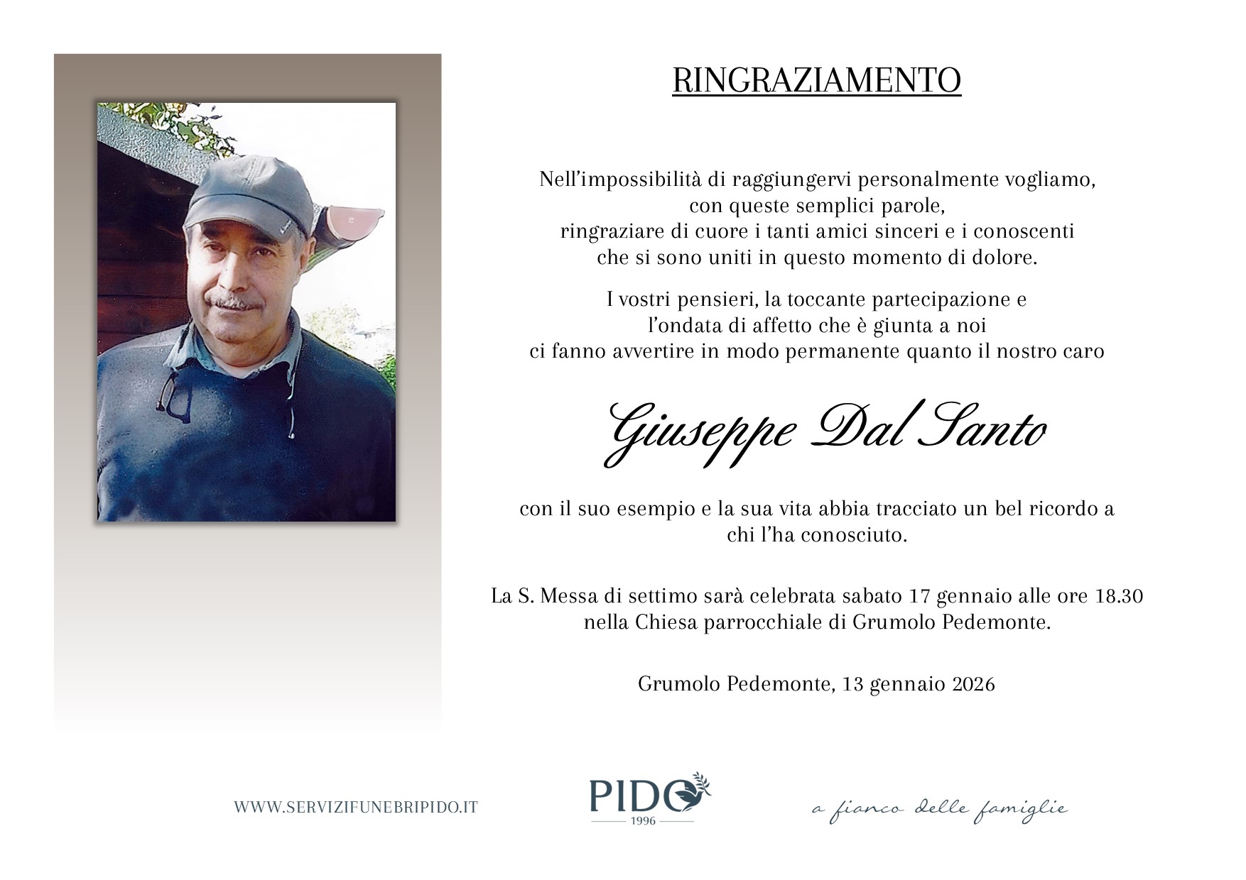 Giuseppe Dal SantoVinicio Pido2026-01-13T14:24:59+01:00 Stampa in ricordoMessaggio di cordoglioSuggerimenti frasi di cordoglioInvia un messaggio di cordoglio alla famiglia. Il messaggio verrà recapitato in forma privata. Privacy Policy *Devi accettare le condizioni sulla privacyHo letto l’informativa e autorizzo il trattamento dei miei dati personali per le finalità ivi indicate. *Invia messaggioGrazie, il suo messaggio di cordoglio verrà recapitato in forma privata alla famiglia.×Si è verificato un errore nel tentativo di inviare il suo messaggio. Per favore riprova più tardi.× Condividi il suo ricordo FacebookXWhatsAppEmail