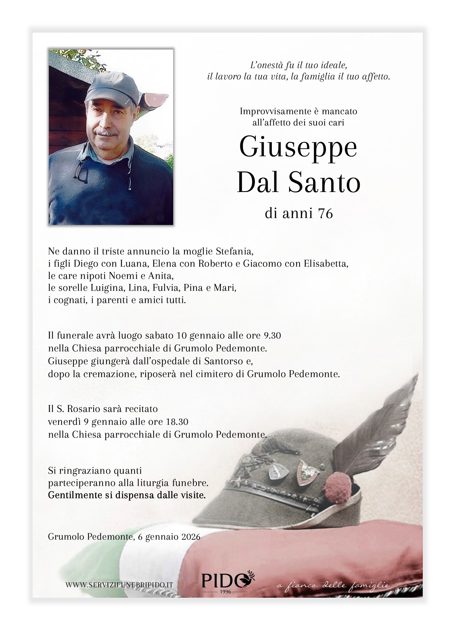 Giuseppe Dal SantoVinicio Pido2026-01-07T15:04:58+01:00 Stampa in ricordoMessaggio di cordoglioSuggerimenti frasi di cordoglioInvia un messaggio di cordoglio alla famiglia. Il messaggio verrà recapitato in forma privata. Privacy Policy *Devi accettare le condizioni sulla privacyHo letto l’informativa e autorizzo il trattamento dei miei dati personali per le finalità ivi indicate. *Invia messaggioGrazie, il suo messaggio di cordoglio verrà recapitato in forma privata alla famiglia.×Si è verificato un errore nel tentativo di inviare il suo messaggio. Per favore riprova più tardi.× Condividi il suo ricordo FacebookXWhatsAppEmail