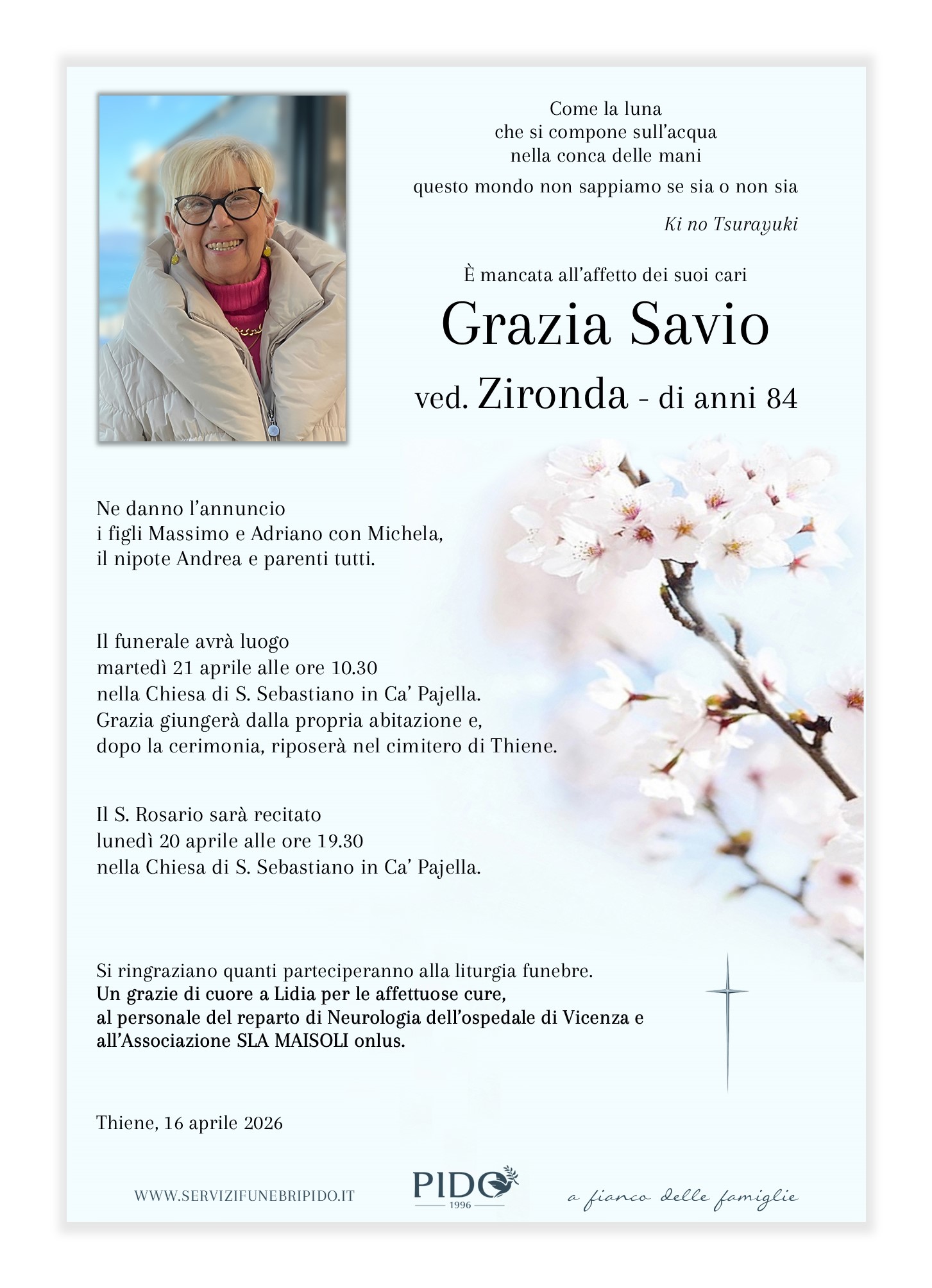 Grazia SavioVinicio Pido2026-04-17T15:15:19+02:00 Stampa in ricordoMessaggio di cordoglioSuggerimenti frasi di cordoglioInvia un messaggio di cordoglio alla famiglia. Il messaggio verrà recapitato in forma privata. Privacy Policy *Devi accettare le condizioni sulla privacyHo letto l’informativa e autorizzo il trattamento dei miei dati personali per le finalità ivi indicate. *Invia messaggioGrazie, il suo messaggio di cordoglio verrà recapitato in forma privata alla famiglia.×Si è verificato un errore nel tentativo di inviare il suo messaggio. Per favore riprova più tardi.× Condividi il suo ricordo FacebookXWhatsAppEmail