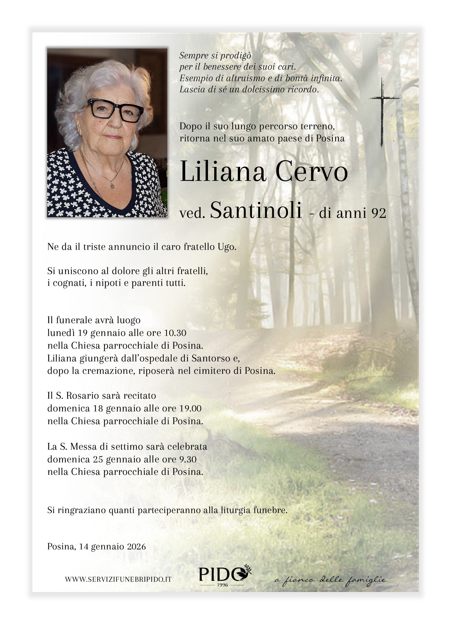 Liliana CervoVinicio Pido2026-01-15T16:25:47+01:00 Stampa in ricordoMessaggio di cordoglioSuggerimenti frasi di cordoglioInvia un messaggio di cordoglio alla famiglia. Il messaggio verrà recapitato in forma privata. Privacy Policy *Devi accettare le condizioni sulla privacyHo letto l’informativa e autorizzo il trattamento dei miei dati personali per le finalità ivi indicate. *Invia messaggioGrazie, il suo messaggio di cordoglio verrà recapitato in forma privata alla famiglia.×Si è verificato un errore nel tentativo di inviare il suo messaggio. Per favore riprova più tardi.× Condividi il suo ricordo FacebookXWhatsAppEmail