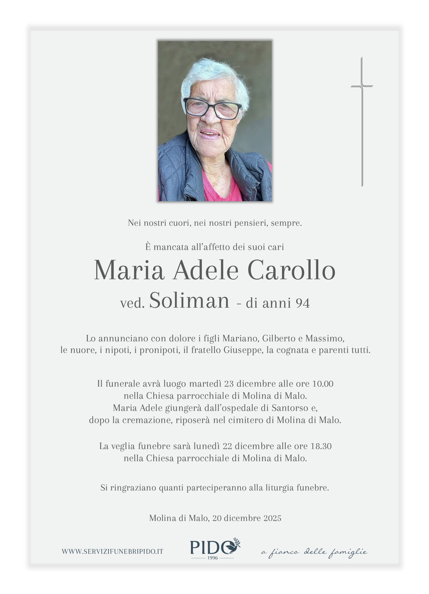 Maria Adele CarolloVinicio Pido2025-12-20T11:44:41+01:00 Stampa in ricordoMessaggio di cordoglioSuggerimenti frasi di cordoglioInvia un messaggio di cordoglio alla famiglia. Il messaggio verrà recapitato in forma privata. Privacy Policy *Devi accettare le condizioni sulla privacyHo letto l’informativa e autorizzo il trattamento dei miei dati personali per le finalità ivi indicate. *Invia messaggioGrazie, il suo messaggio di cordoglio verrà recapitato in forma privata alla famiglia.×Si è verificato un errore nel tentativo di inviare il suo messaggio. Per favore riprova più tardi.× Condividi il suo ricordo FacebookXWhatsAppEmail