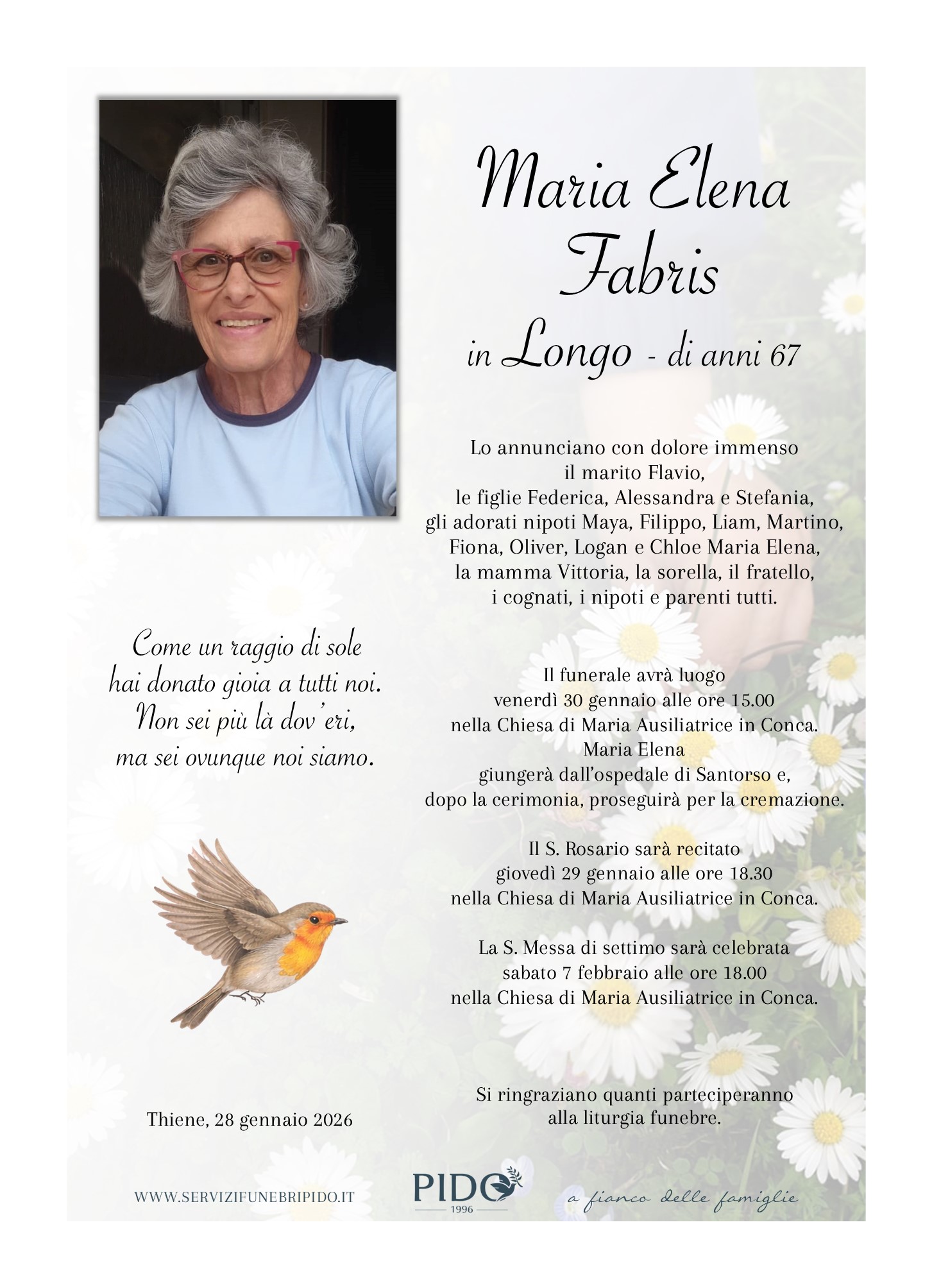 Maria Elena FabrisVinicio Pido2026-01-28T17:42:45+01:00 Stampa in ricordoMessaggio di cordoglioSuggerimenti frasi di cordoglioInvia un messaggio di cordoglio alla famiglia. Il messaggio verrà recapitato in forma privata. Privacy Policy *Devi accettare le condizioni sulla privacyHo letto l’informativa e autorizzo il trattamento dei miei dati personali per le finalità ivi indicate. *Invia messaggioGrazie, il suo messaggio di cordoglio verrà recapitato in forma privata alla famiglia.×Si è verificato un errore nel tentativo di inviare il suo messaggio. Per favore riprova più tardi.× Condividi il suo ricordo FacebookXWhatsAppEmail