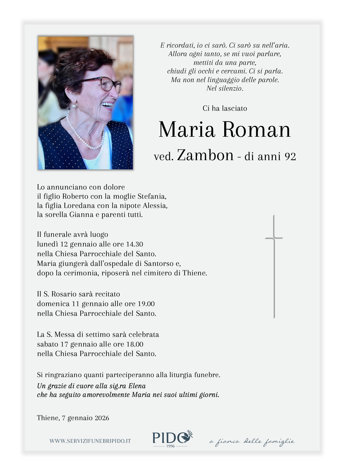 Maria RomanVinicio Pido2026-01-08T11:58:55+01:00 Stampa in ricordoMessaggio di cordoglioSuggerimenti frasi di cordoglioInvia un messaggio di cordoglio alla famiglia. Il messaggio verrà recapitato in forma privata. Privacy Policy *Devi accettare le condizioni sulla privacyHo letto l’informativa e autorizzo il trattamento dei miei dati personali per le finalità ivi indicate. *Invia messaggioGrazie, il suo messaggio di cordoglio verrà recapitato in forma privata alla famiglia.×Si è verificato un errore nel tentativo di inviare il suo messaggio. Per favore riprova più tardi.× Condividi il suo ricordo FacebookXWhatsAppEmail