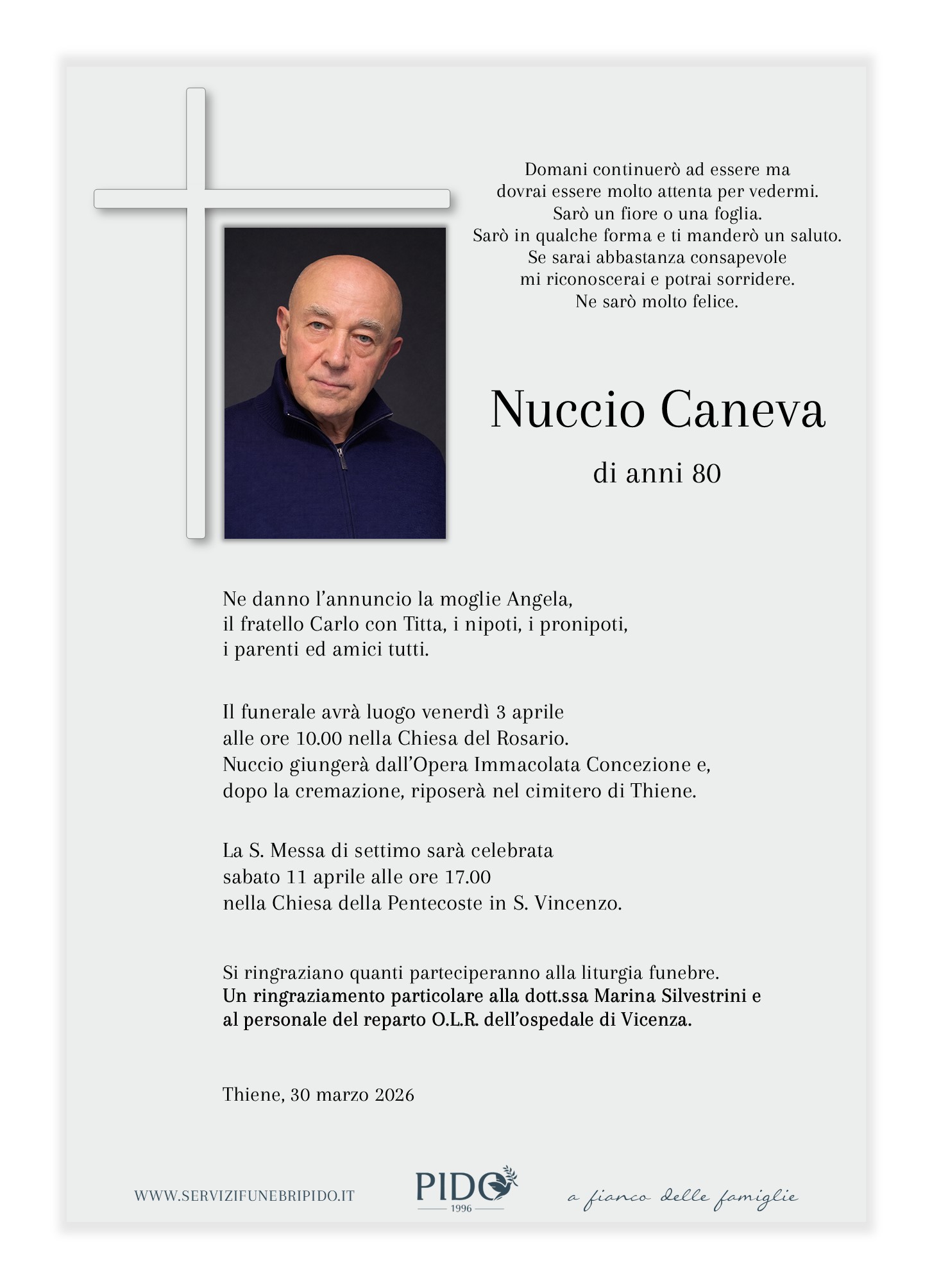 Nuccio CanevaVinicio Pido2026-03-31T11:14:02+02:00 Stampa in ricordoMessaggio di cordoglioSuggerimenti frasi di cordoglioInvia un messaggio di cordoglio alla famiglia. Il messaggio verrà recapitato in forma privata. Privacy Policy *Devi accettare le condizioni sulla privacyHo letto l’informativa e autorizzo il trattamento dei miei dati personali per le finalità ivi indicate. *Invia messaggioGrazie, il suo messaggio di cordoglio verrà recapitato in forma privata alla famiglia.×Si è verificato un errore nel tentativo di inviare il suo messaggio. Per favore riprova più tardi.× Condividi il suo ricordo FacebookXWhatsAppEmail