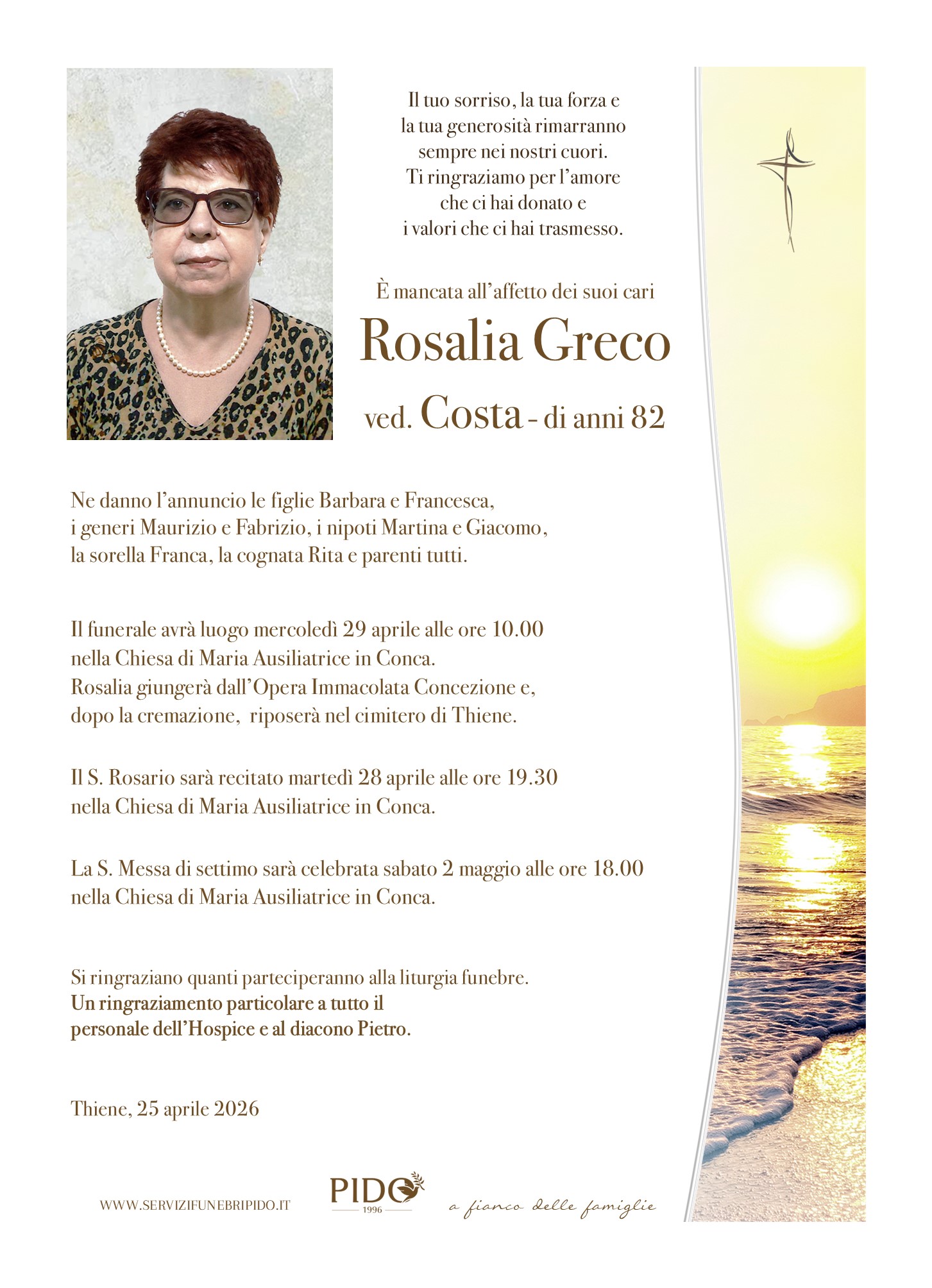 Rosalia GrecoVinicio Pido2026-04-25T13:32:47+02:00 Stampa in ricordoMessaggio di cordoglioSuggerimenti frasi di cordoglioInvia un messaggio di cordoglio alla famiglia. Il messaggio verrà recapitato in forma privata. Privacy Policy *Devi accettare le condizioni sulla privacyHo letto l’informativa e autorizzo il trattamento dei miei dati personali per le finalità ivi indicate. *Invia messaggioGrazie, il suo messaggio di cordoglio verrà recapitato in forma privata alla famiglia.×Si è verificato un errore nel tentativo di inviare il suo messaggio. Per favore riprova più tardi.× Condividi il suo ricordo FacebookXWhatsAppEmail