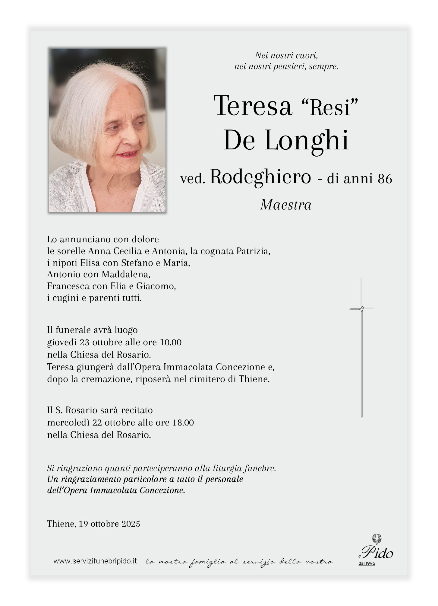 Teresa “Resi” De LonghiVinicio Pido2025-10-19T12:43:58+02:00 Stampa in ricordoMessaggio di cordoglioSuggerimenti frasi di cordoglioInvia un messaggio di cordoglio alla famiglia. Il messaggio verrà recapitato in forma privata. Privacy Policy *Devi accettare le condizioni sulla privacyHo letto l’informativa e autorizzo il trattamento dei miei dati personali per le finalità ivi indicate. *Invia messaggioGrazie, il suo messaggio di cordoglio verrà recapitato in forma privata alla famiglia.×Si è verificato un errore nel tentativo di inviare il suo messaggio. Per favore riprova più tardi.× Condividi il suo ricordo FacebookXWhatsAppEmail