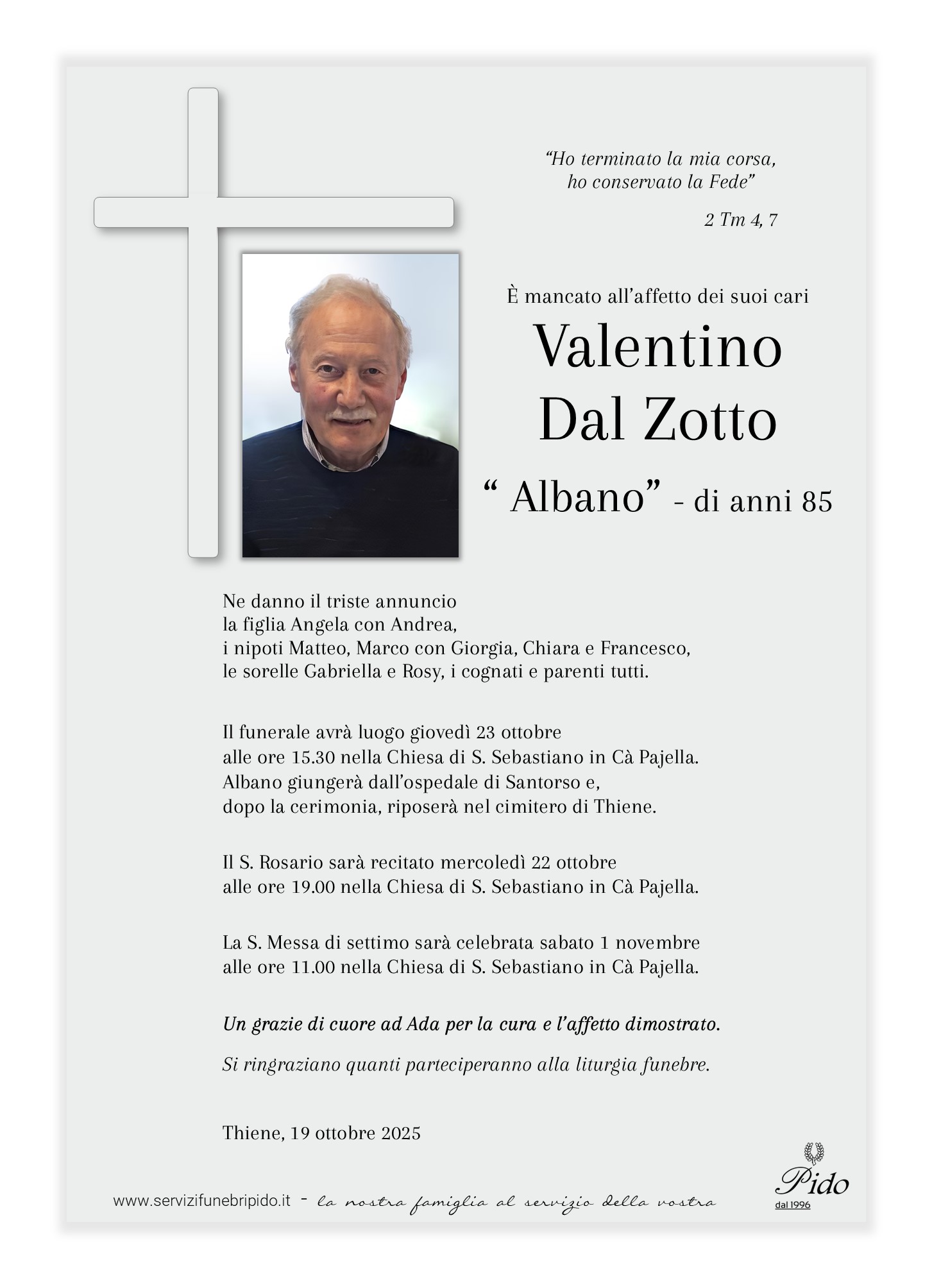 Valentino Dal Zotto “Albano”Vinicio Pido2025-10-20T12:23:49+02:00 Stampa in ricordoMessaggio di cordoglioSuggerimenti frasi di cordoglioInvia un messaggio di cordoglio alla famiglia. Il messaggio verrà recapitato in forma privata. Privacy Policy *Devi accettare le condizioni sulla privacyHo letto l’informativa e autorizzo il trattamento dei miei dati personali per le finalità ivi indicate. *Invia messaggioGrazie, il suo messaggio di cordoglio verrà recapitato in forma privata alla famiglia.×Si è verificato un errore nel tentativo di inviare il suo messaggio. Per favore riprova più tardi.× Condividi il suo ricordo FacebookXWhatsAppEmail